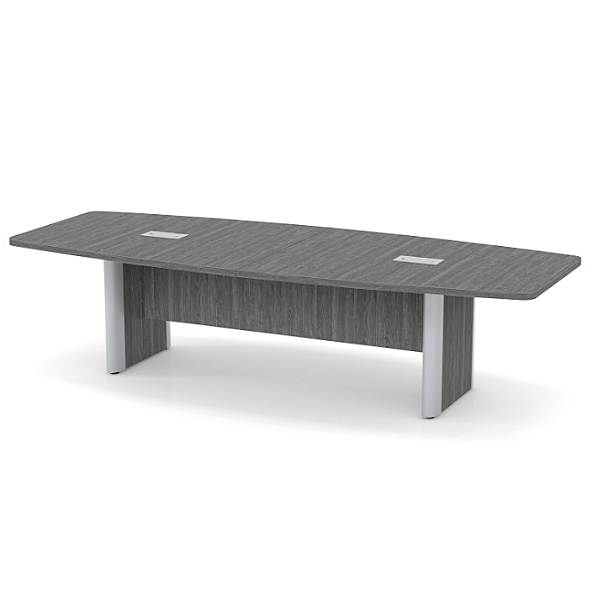 10′ boat-shaped conference table features a silver or black accent elliptical legs providing modern styling. Boat shaped conference table measures 120″W x 47″D with dual surface grommets with option to add in-surface data and power. Select finishes include either a black or silver elliptical panel leg base.