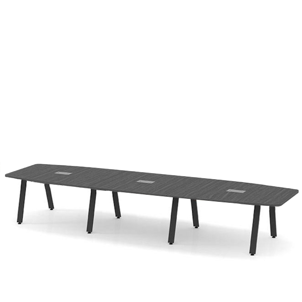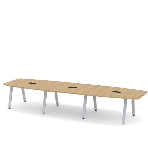 Modern angled leg base conference table offers 11 durable laminate surface finishes. Steel kick-out steel oblique legs in black or silver each include steel mounting plates with centered steel support beams to connect leg-to-leg, providing a stable foundation.