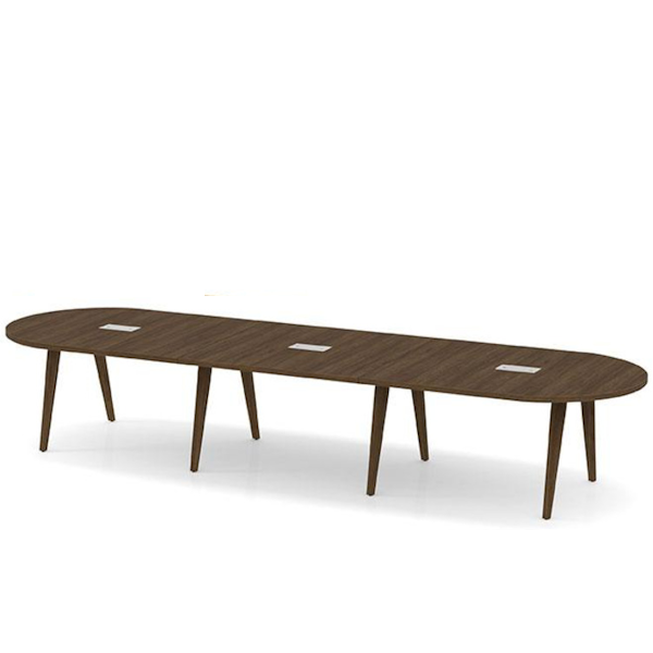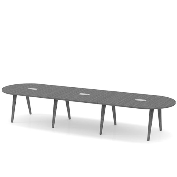 Oval shaped conference table with angled, kick-out wood oblique legs in 3 finishes each include steel mounting plates with six centered steel support beams providing a stable foundation for this expandable table. Four surface finish colors available to color coordinate to wood legs below.