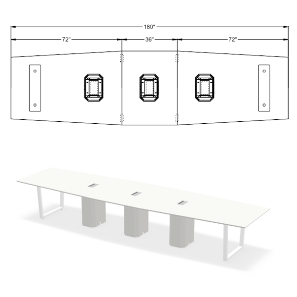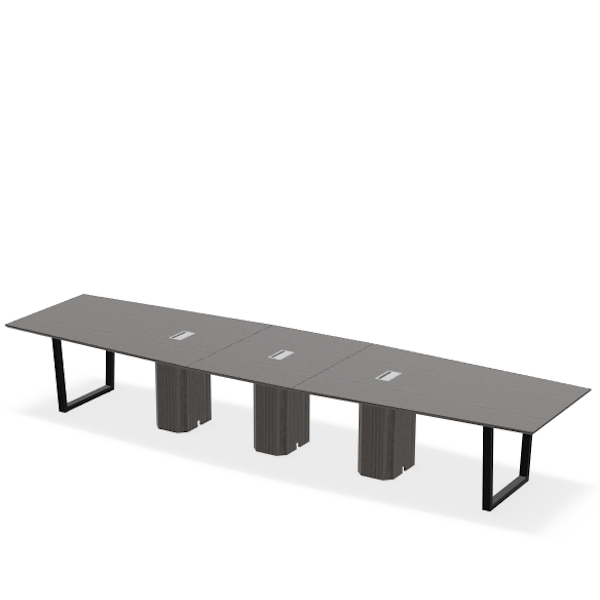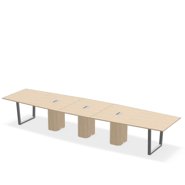 Power-ready, sleigh leg cabinet base conference table with knife-edge perimeter surface and angled steel legs. Set of 3 durable laminate cabinet bases with access doors each hold cables from optional surface power module.