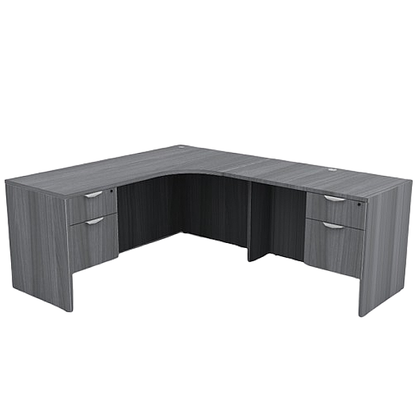 Corner desk with interior curved surface. Double pedestal 66″ L-shaped corner desk is available in 4 reversible footprints. Select from 11 in-stock high-density laminate finishes. Includes two locking 2-drawer box/file pedestal with set of keys. Non-porous commercial laminate finish resists nicks and scratches.