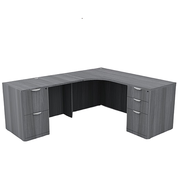 Corner desk with interior curved surface. 6′ L-shaped double pedestal desk is available in 4 reversible footprints. Select from 11 in-stock high-density laminate finishes. Includes locking 3-drawer box/box/file + 2-drawer file/file pedestal storage with set of keys.