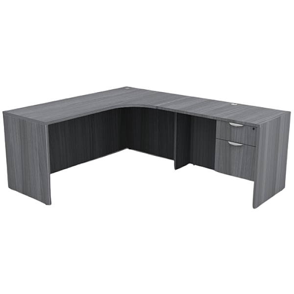 Corner desk offers 4 return sizes tailored to fit different sizes of offices. Designed for wall-facing placement, this L-shaped corner desk includes locking 2-drawer box/file storage. Interior curved surface provides more surface depth for dual monitors. Space-saver corner desk with a flush front modesty panel.