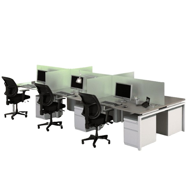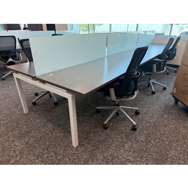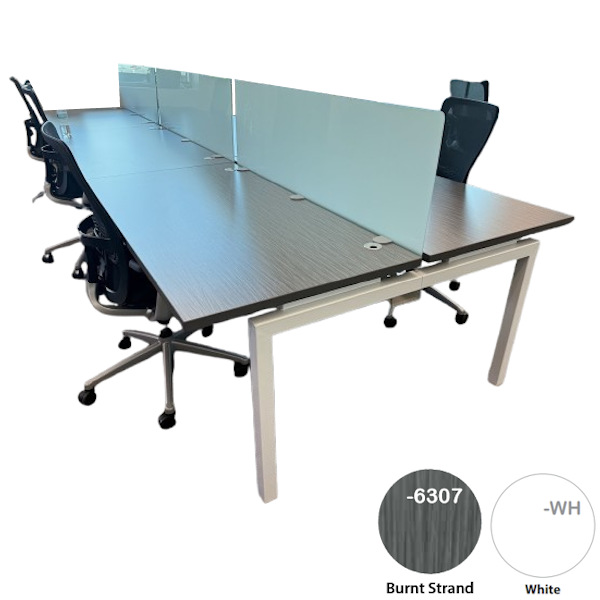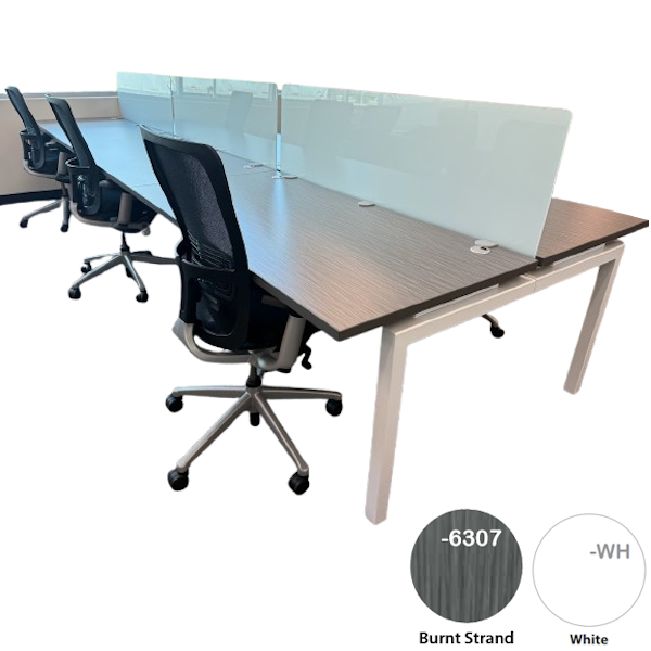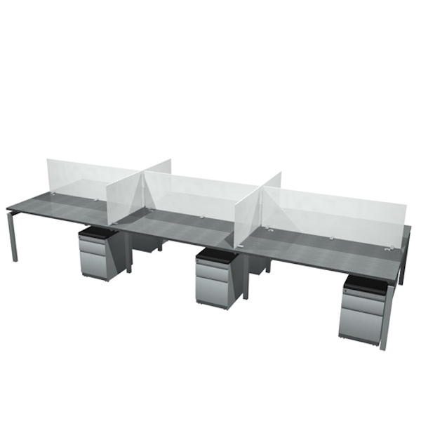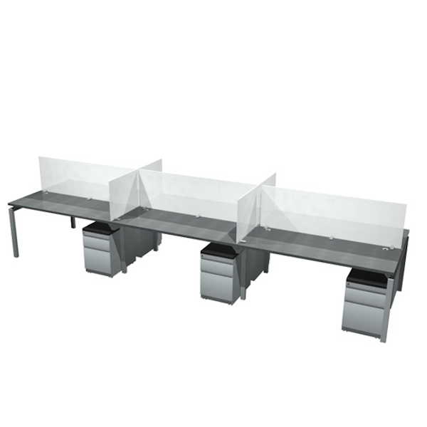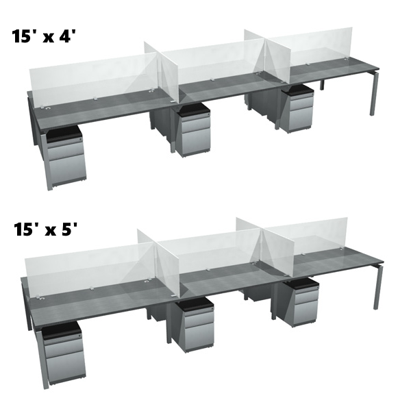 Set of 6 Bench iT team workstations in a facing team setup spanning 15′ in length. This setup includes five 19″H writable/dry erase Frosted White Glass dividers that breathe elegance into the office. Tempered glass surfaces are writable making it an ideal tool for writing notes using a dry erasable marker. With a built-in center wire trough equipped for daisy-chain power and data, this modular desk set provides quality and value.