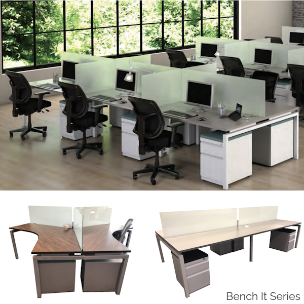 Bench It series modular team desk is available in either 24″ or 30″D surfaces in 7 finish colors and bases and storage in 3 paint finishes. Stocked for convenience within the Metroplex, its availability is appealing for those seeking quality, value with ready product. National shipping on wood pallet via large freight truck.