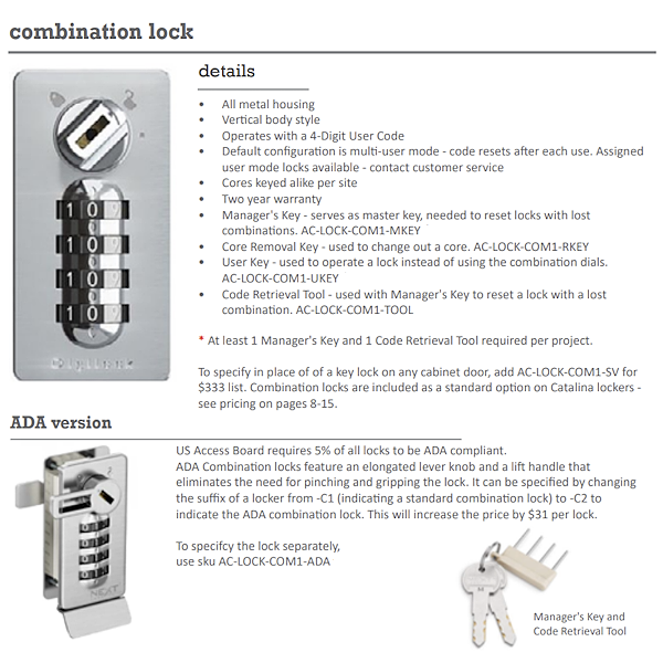 - Includes Combination Locks (12) + ADA Combination Locks (4)