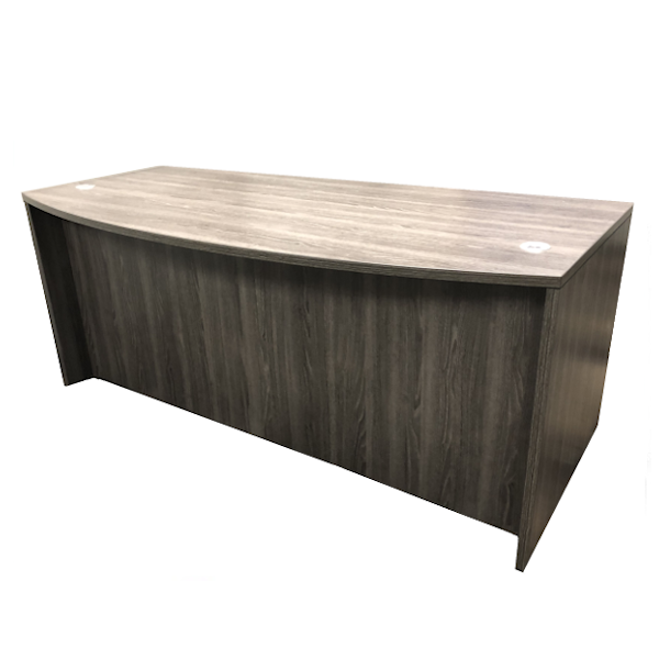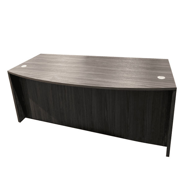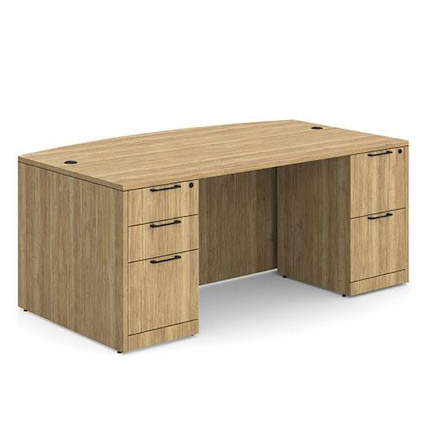 Stocked in 11 durable finishes, this deeper bow front executive desk features dual locking storage pedestals. Double pedestal desk includes locking 3-drawer Box/Box/File and 2-drawer File/File storage. See several more desks, storage, and tables in our Coppell showroom allowing you to see finish colors in person!
