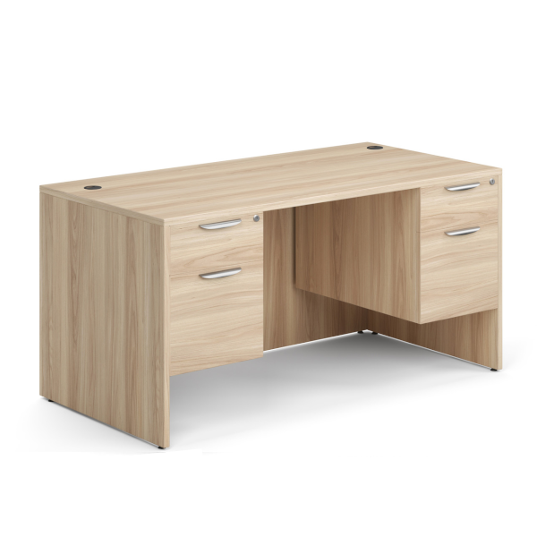 Double pedestal desk with choice of 2-drawer “hanging” box/file pedestals or full 3-drawer box/box/file + 2-drawer file/file set of pedestals. In-stock 60″ commercial laminate desk with locking storage is available here in 11 finish colors.