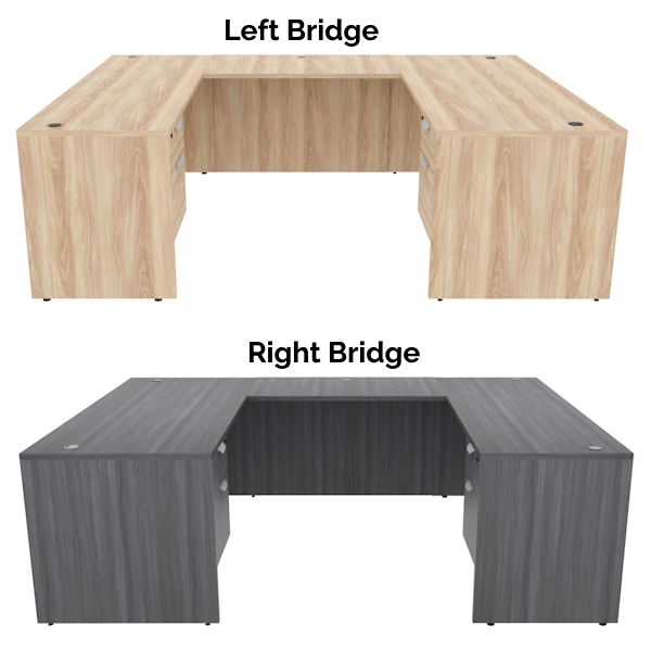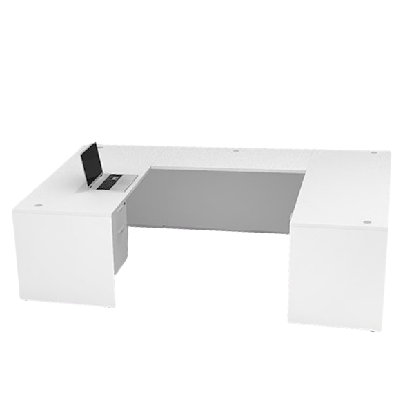 Durable 90° U-desk features 3 sizes of reversible bridges complete with dual locking 2-drawer box/file pedestals. Available in 11 durable laminate finish colors. Double pedestal U-shaped desk with 90° interior features 5 surface grommets for cable management from desktop electronics.