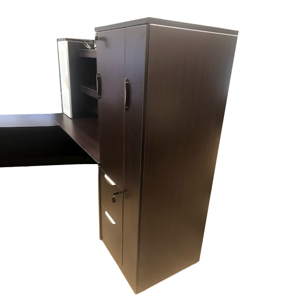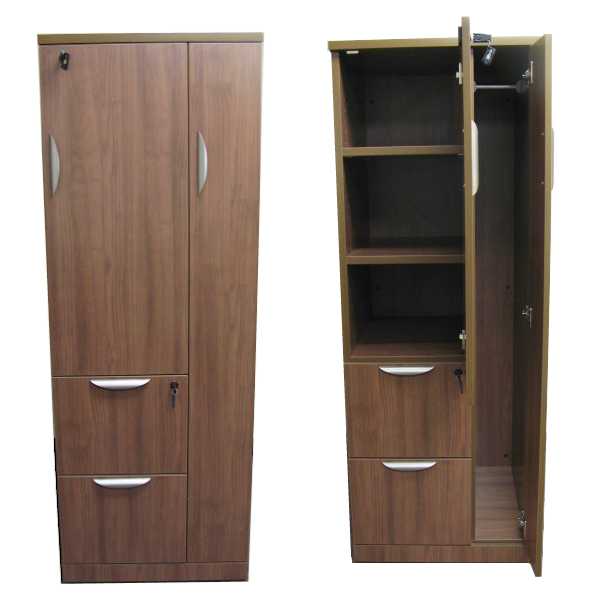 Filing wardrobe storage cabinet is available in 12 high-density laminate finishes. This storage tower includes two filing drawers, upper storage compartment, and single door wardrobe section with coat rod. Cabinet ships assembled.