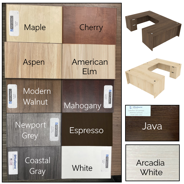 U-shaped desk includes either black or silver crescent-shaped drawer pulls. Alternative drawer pull hardware available in five styles (ask us!). Each desk and credenza portion include two round surface grommets for routing cables and cords from desktop electronics.
