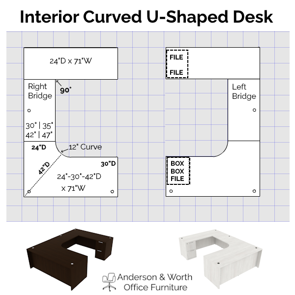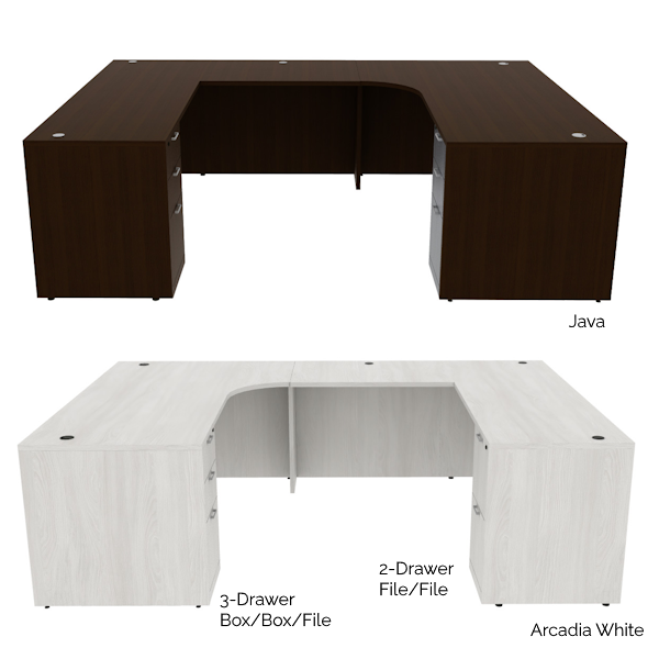 Double pedestal interior curve U-desk includes locking 3-drawer Box/Box/File + 2-drawer File/File storage. This u-desk’s key feature is its front interior curve surface with 42″ of depth for dual or triple monitors. The 42″ distance allows for more monitor coverage while keeping monitors at a proper eye-level distance when at work.