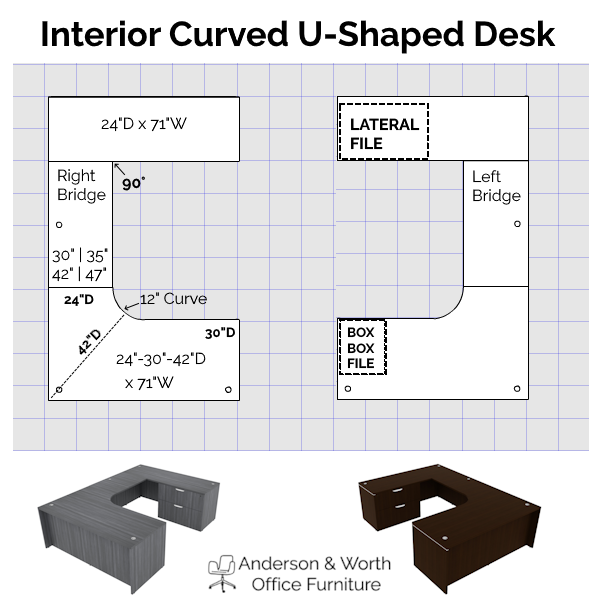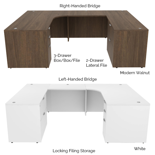 Double pedestal interior curve U-desk includes locking 3-drawer box/box/file + 2-drawer lateral file (for credenza). Lateral file credenza storage features dual locking large file drawers.