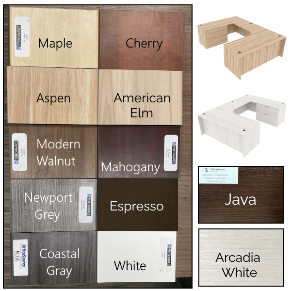 U-shaped desk includes either black or silver crescent-shaped drawer pulls. Alternative drawer pull hardware available in five styles (ask us!). Each desk and credenza portion include two round surface grommets for routing cables and cords from desktop electronics.