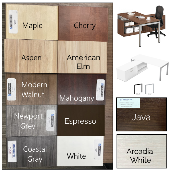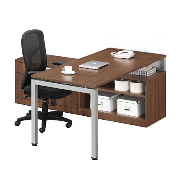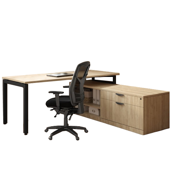 L-shaped desk provides contract furniture quality with its drop-down file bench forming a change of height desk. Select from Matte Black or Silver steel leg finishes and two-drawer box/file lateral and open shelf storage bench at a lower 21″H. This L-shaped desk configures 90° either left or right-handed.