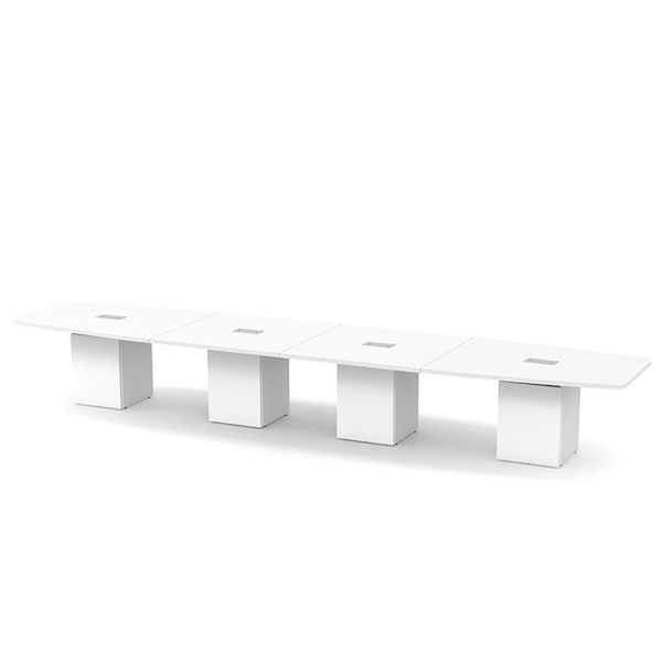 Performance Laminate 18′ four-piece boat shaped conference table in 10 color finishes. Conference surfaces are extra thick in a non-porous commercial laminate with 3mm edge banding for impact resistance. Cubed box bases each include an access door for cable management. Bases are designed to house data and power cables from above optional recessed power module for ideal placement over floor core power receptacles.