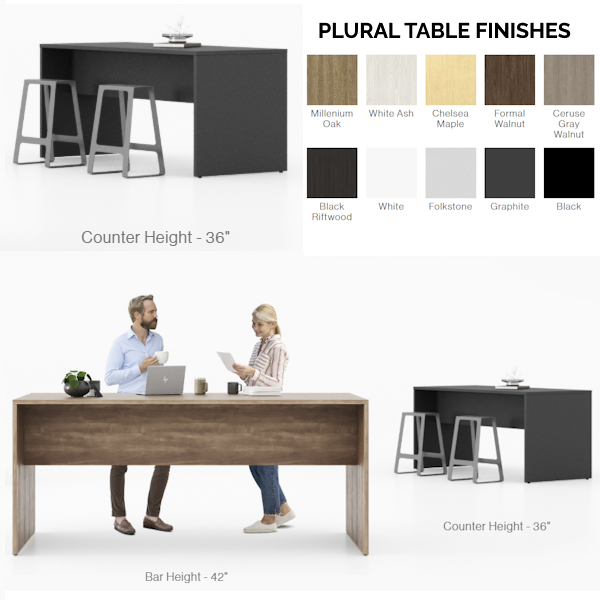 - Plural tables available in counter height (36″) + bar height (42″)