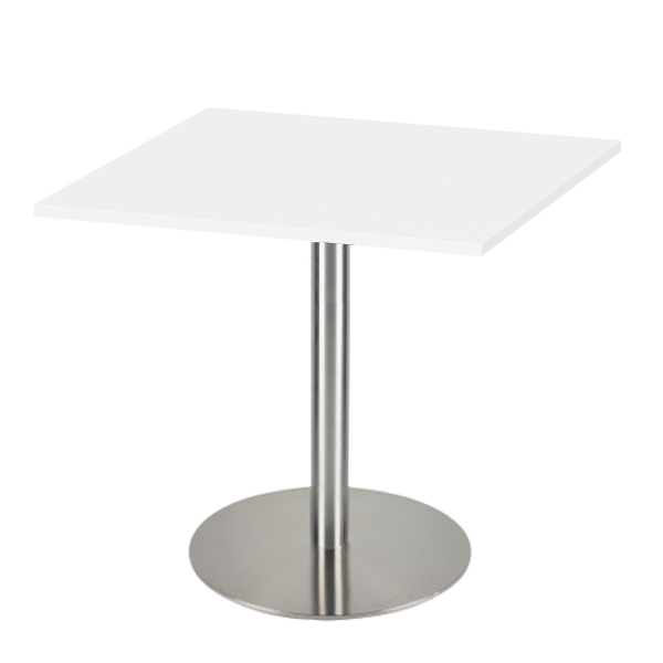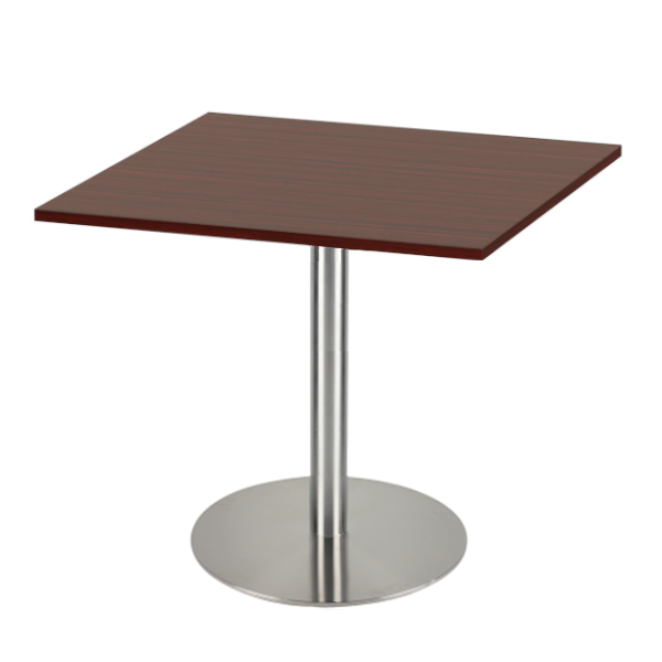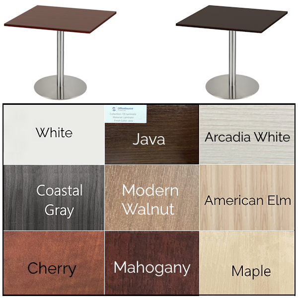 Choose from three surface sizes to contrast round disc base finished in Brushed Aluminum. Surfaces are available in 9 durable laminate finishes. Round disc base includes adjustable leveling glides for added stability on common uneven flooring. Ideal for breakrooms, conference areas, and larger private offices.