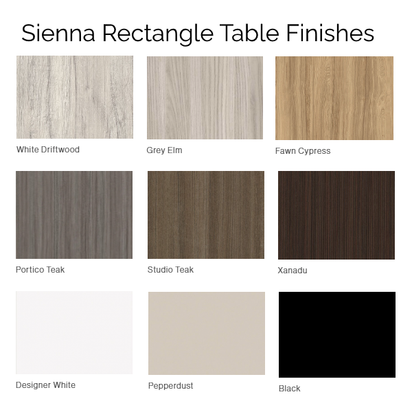 The Sienna Rectangle Table is available here in four sizes with choice of 10 top finishes. Sienna is an exquisite line of furniture designed to meet the needs of hospitality, training, conference, and lounging environments. Crafted with meticulous attention to detail and a perfect blend of functionality, Sienna’s aesthetics elevate any space. Each table in this collection is thoughtfully engineered to provide exceptional durability, ensuring it withstands the rigorous demands of daily use in high-traffic areas.