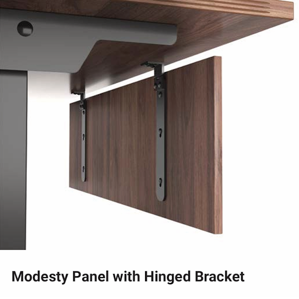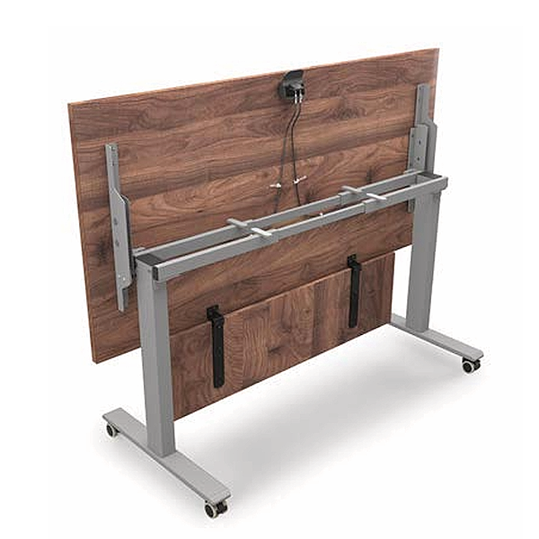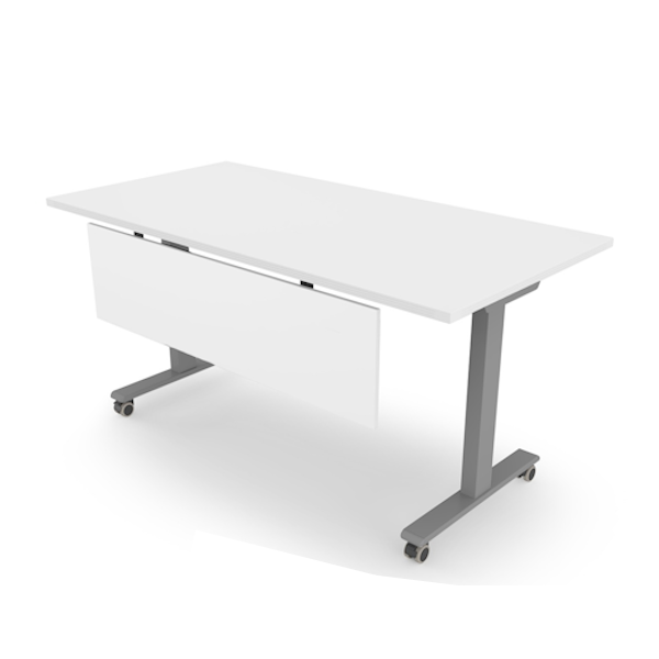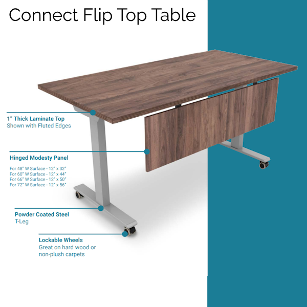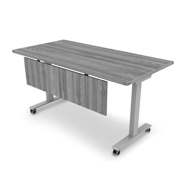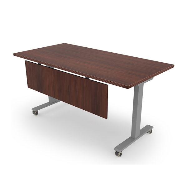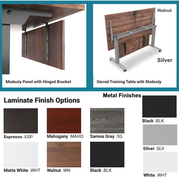 Mobile training table with silver base features front folding laminate modesty panel with option to mix and match finishes. Enhance the look of your table while giving everyone visual privacy below the surface. Steel hinged bracket attaches directly to the top of the training table, allowing the modesty panel to hang freely when the table is nested for storage or in use. The modesty panel is available for widths between 48” and 72” and measures 1/4 of an inch thick.