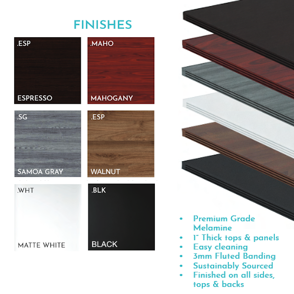 - Footprints (6): 48″ | 60″ | 72″W x 24″ or 30″D x 29.5″H
