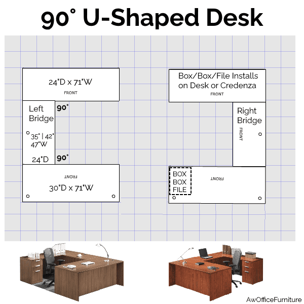 Durable 90° U-desk with 30″D front worksurface offers three reversible bridge sizes with single 3-drawer box/box/file storage pedestal. Available here in 11 commercial graded laminate finishes.