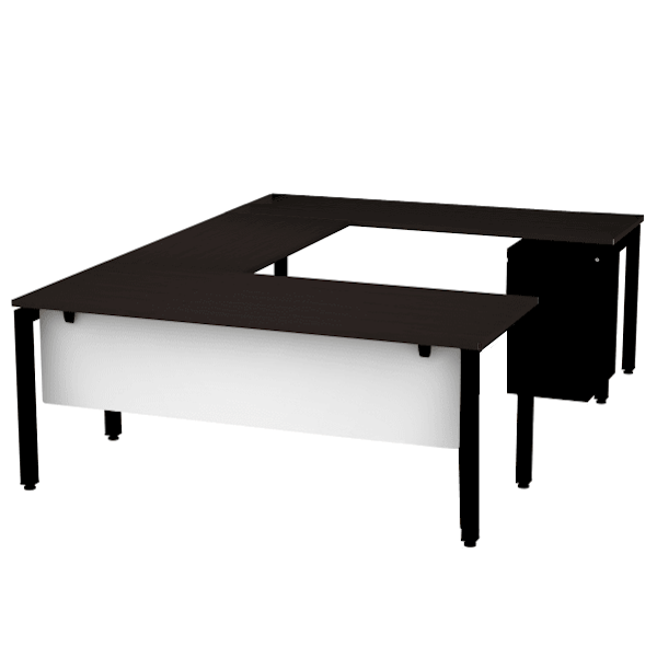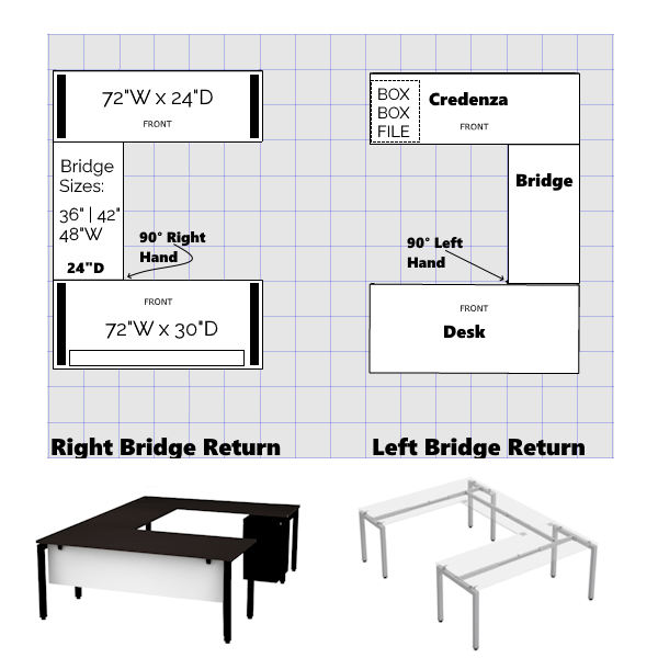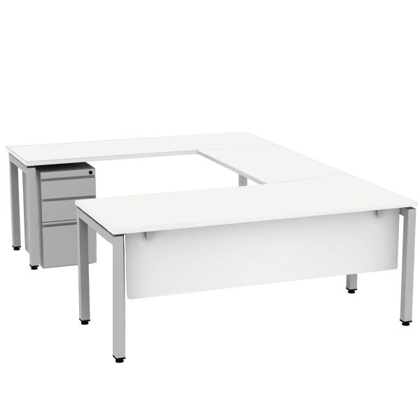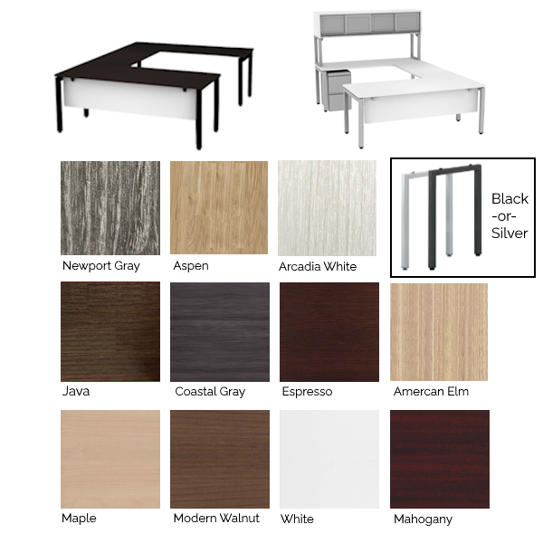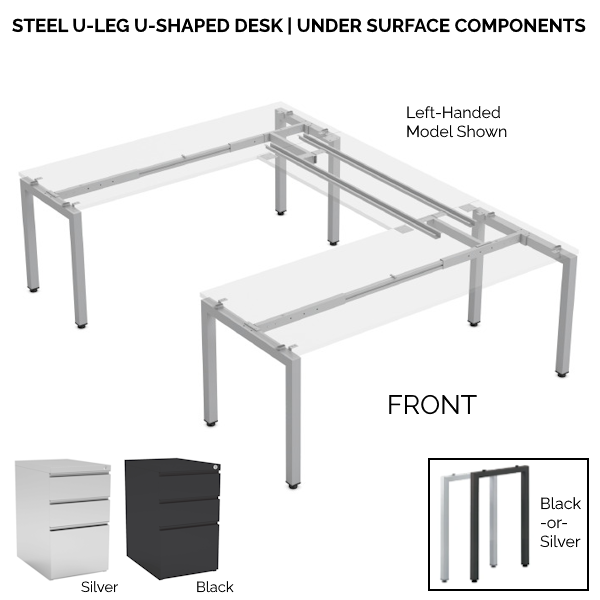 Steel base U-desk includes 3 reversible sizes of bridges with single tuck-under 3-drawer box/box/file pedestal (28″H) in Black or Silver. Select from three reversible bridge sizes from 36″-48″. Front mount frosted acrylic modesty panel with mounting hardware provides privacy below surface at 66″W x 15″H. Select from 11 durable laminate surfaces to contrast with either black or silver U-legs, frame and mounting brackets.