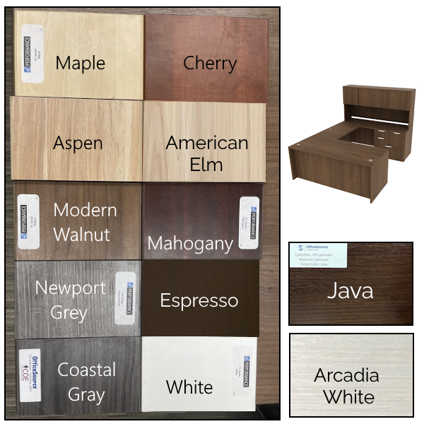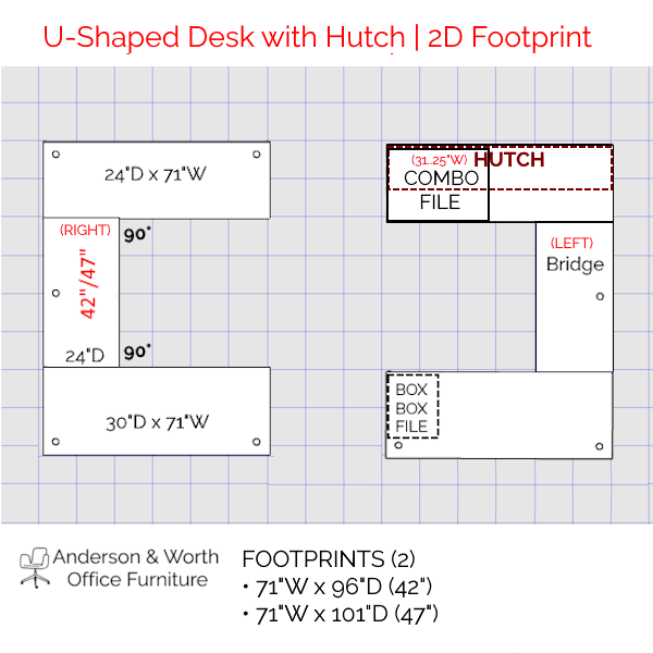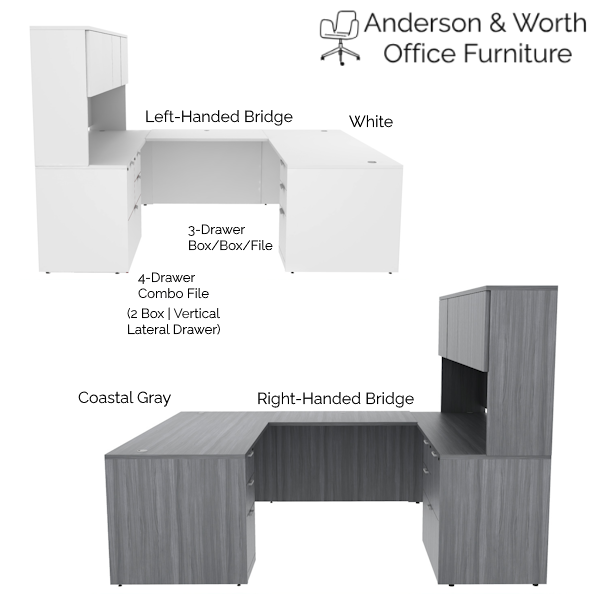 Durable double pedestal U-desk (box/box/file + combo file) with 4-door storage hutch. Stocked in 11 finish colors, this u-shaped desk features locking 3-drawer desk storage and multi-drawer combo file credenza storage to secure personal items and store letter or legal files and folders in the vertical and lateral drawers. Each surface includes round wire grommets (5 total) for routing cables and cords from desktop electronics to nearby power source.