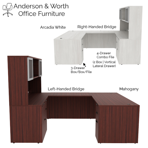 Durable double pedestal U-desk (box/box/file + combo file) with frosted glass two-door hutch (swing doors). Stocked in 11 finish colors, this u-shaped desk features locking 3-drawer desk storage and multi-drawer combo file credenza storage to secure personal items and store letter or legal files and folders in the vertical and lateral drawers. Each surface includes round wire grommets (5 total) for routing cables and cords from desktop electronics to nearby power source.