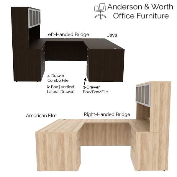 Durable double pedestal U-desk (box/box/file + combo file) with frosted glass four-door hutch (swing doors). Stocked in 11 finish colors, this u-shaped desk features locking 3-drawer desk storage and multi-drawer combo file credenza storage to secure personal items and store letter or legal files and folders in the vertical and lateral drawers. Each surface includes round wire grommets (5 total) for routing cables and cords from desktop electronics to nearby power source.