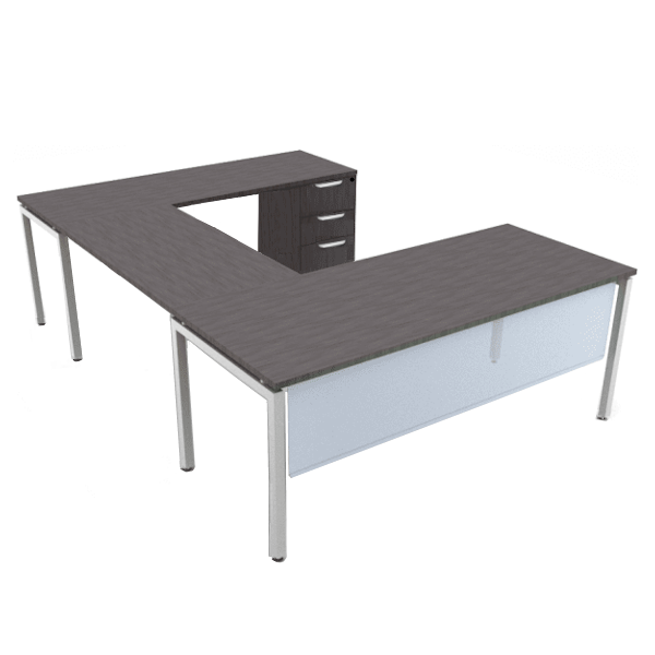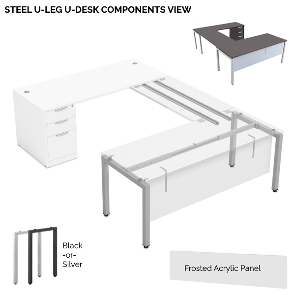 Steel U-Leg U-Desk with front modesty panel in a durable Frosted Acrylic material. Open leg base with locking 3-drawer box/box/file pedestal on credenza. Stocked in 11 durable laminate finishes to contrast with two contrasting steel U-leg finish colors in black or silver. Front modesty panel measures 66″W x 15″H with mounting hardware included in choice of black or silver to match legs selection.