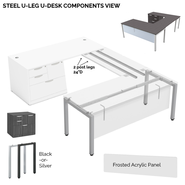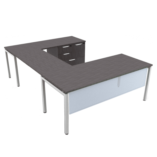 Steel U-Leg U-Desk with front modesty panel in a durable Frosted Acrylic material. Open leg base with locking 4-drawer Combo File pedestal on credenza. Combo file pedestal includes two box drawers, lateral and vertical drawer. Stocked in 11 durable laminate finishes to contrast with two contrasting steel U-leg finish colors in black or silver. Front modesty panel measures 66″W x 15″H with mounting hardware included in choice of black or silver to match legs selection.