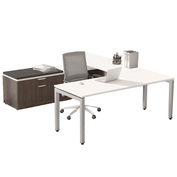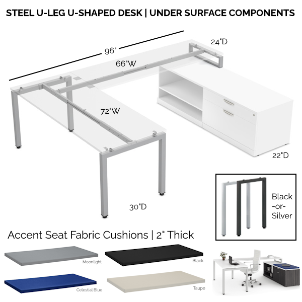 Low File Bench U-Desk provides a clean look with drop-down file bench credenza. Modern look with steel U-leg base in a 30″D x 72″W front desk with 90° 60″W bridge that configures 90° left or right-handed. Low file bench cabinet features one side with two locking box/file drawers with an open two-shelf bookcase. U-Desk configures either left or right-handed. This modular steel leg desk includes 2″ thick fabric seat cushion to file bench. Velcro attached 2″ fabric cushions are available in four great colors.