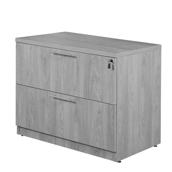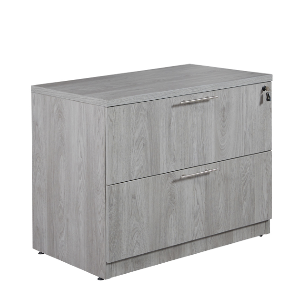 Ultra Premium Gray Oak two-drawer lateral file offers quality pre-assembled file solution for offices preferring a lighter finish with sharp drawer pull hardware.