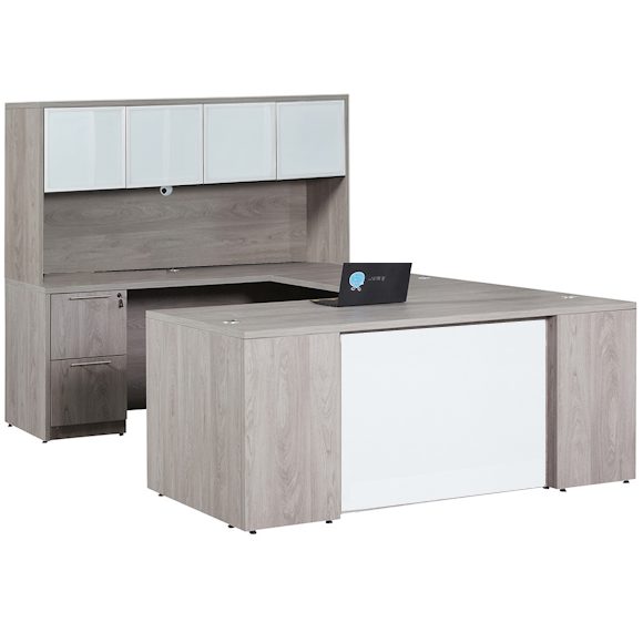 The Ultra Premium Step Front Executive U-Desk with recessed glass panel with optional door hutch includes two full storage pedestals including locking 3-drawer box/box/file & 2-drawer file/file storage pedestals. Add matching laminate 4-door or frosted glass 4-door hutch. Available here in several footprints using two reversible bridge sizes of 42″ & 48″W. Main desk is stocked here in two surface depths of 30″ or 35″D.