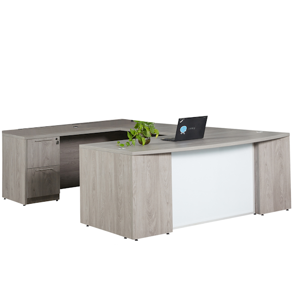 Manufactured by Office Furniture Distributors, the Ultra Premium Step Bow Glass Front Executive U-Desk & Hutch Set includes two full storage pedestals including locking 3-drawer box/box/file & 2-drawer file/file storage pedestals. Select 4-door Laminate or Frosted Glass Hutch for credenza, or you may do without the additional storage hutch. Finished in a proprietary Grey Oak finish.