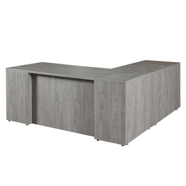 Ultra Premium Step Front Executive L-Shaped Desk in Grey Oak finish includes two full storage pedestals with locking 3-drawer box/box/file & 2-drawer file/file pedestals.