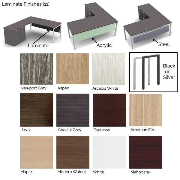 Steel Unite Leg L-Desk with front frosted modesty panel. Open leg L-desk with 4-drawer combo file pedestal. Stocked in 11 durable laminate finishes to contrast with two contrasting steel U-leg finish colors. Front mount Frosted Acrylic modesty panel measures 66″W x 15″H and includes mounting hardware to hang.
