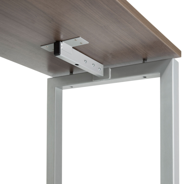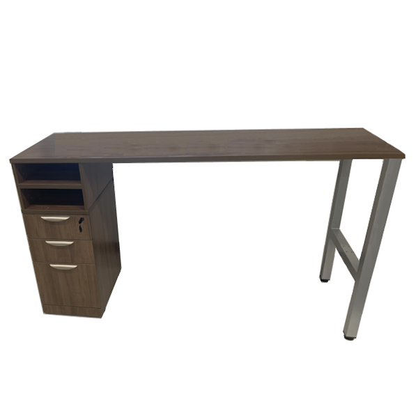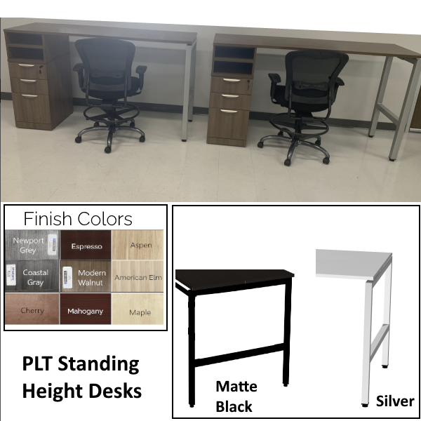 Great value engineer modular standing desk available here in 10 finish colors. Available in 3 sizes, this desk includes 22″D locking 3-drawer box/box/file pedestal with upper open storage compartment. Standing H-leg base is available in black or silver. Available in 11 laminate finishes.