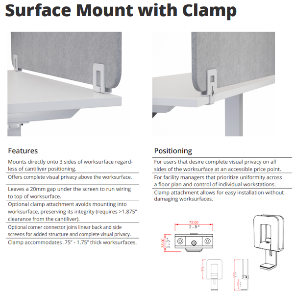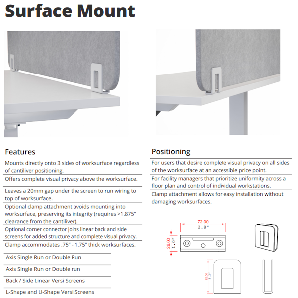 - Surface mount (permanent) or Adjustable Clamp Surface Mount