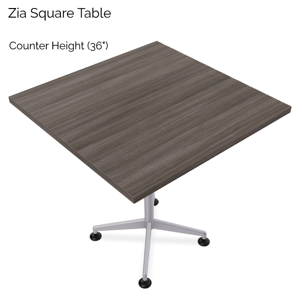 ZIA Square Counter Height Table is available here in 4 quick-ship top finishes to go with a metallic silver base. Zia’s hospitality tables enhance collaboration and productivity with its’ mid-20th-century aesthetic by adding a sense of welcoming comfort to the modern office-scape.